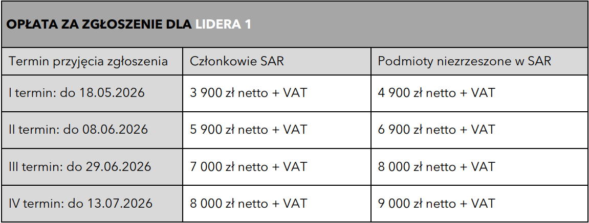 LIDER 1 WNOSI OPŁATĘ ZA CAŁE ZGŁOSZENIE (za wszystkie podmioty wymienione w dokumencie proceduralnym).