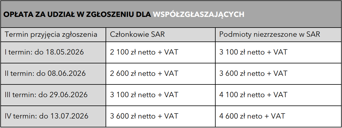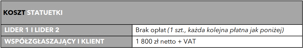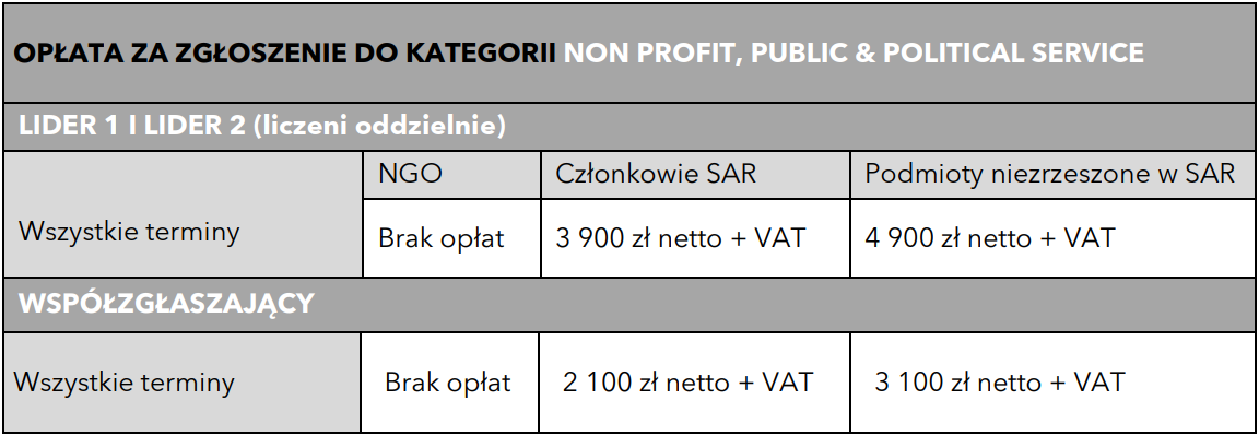 Zgłoszenia do kategorii NON PROFIT, PUBLIC & POLITICAL SERVICE podlegają innym zasadom opłat.